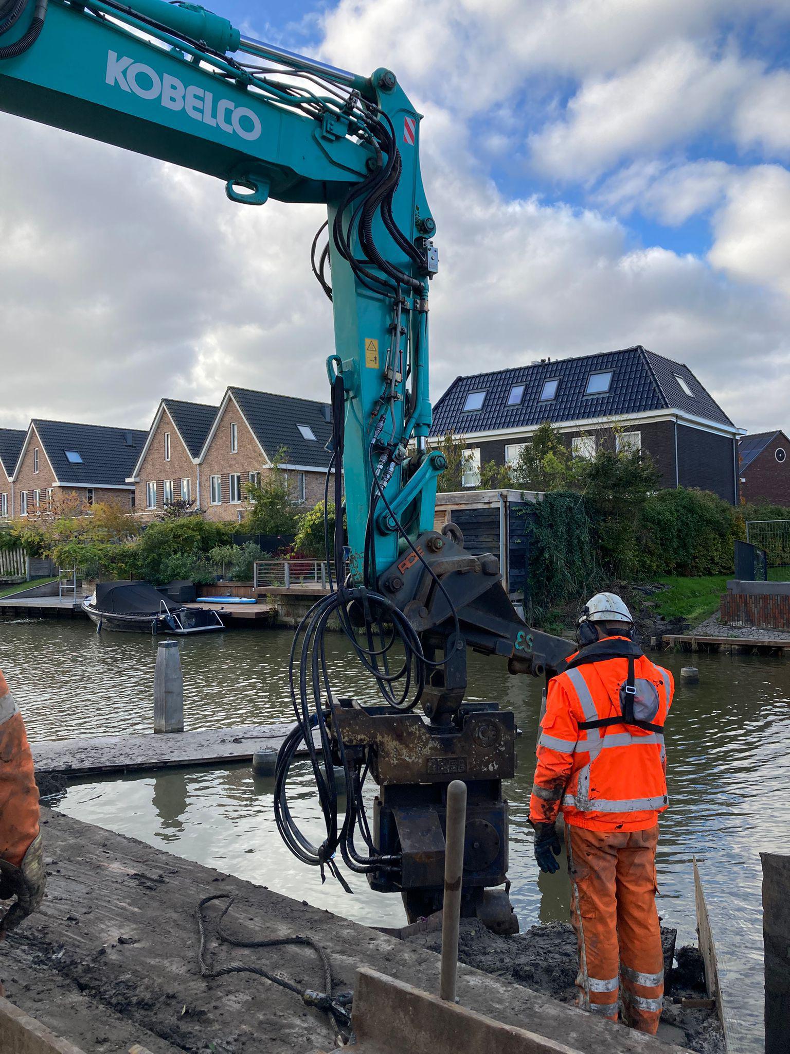 In de Kamerlingh Onnestraat zijn we klaar met het riool! Deze week haalden we met onze machine de damwanden uit het werkvak. De brug zal binnenkort terug worden gezet. U kunt nu dus weer rustig met het bootje langs varen!