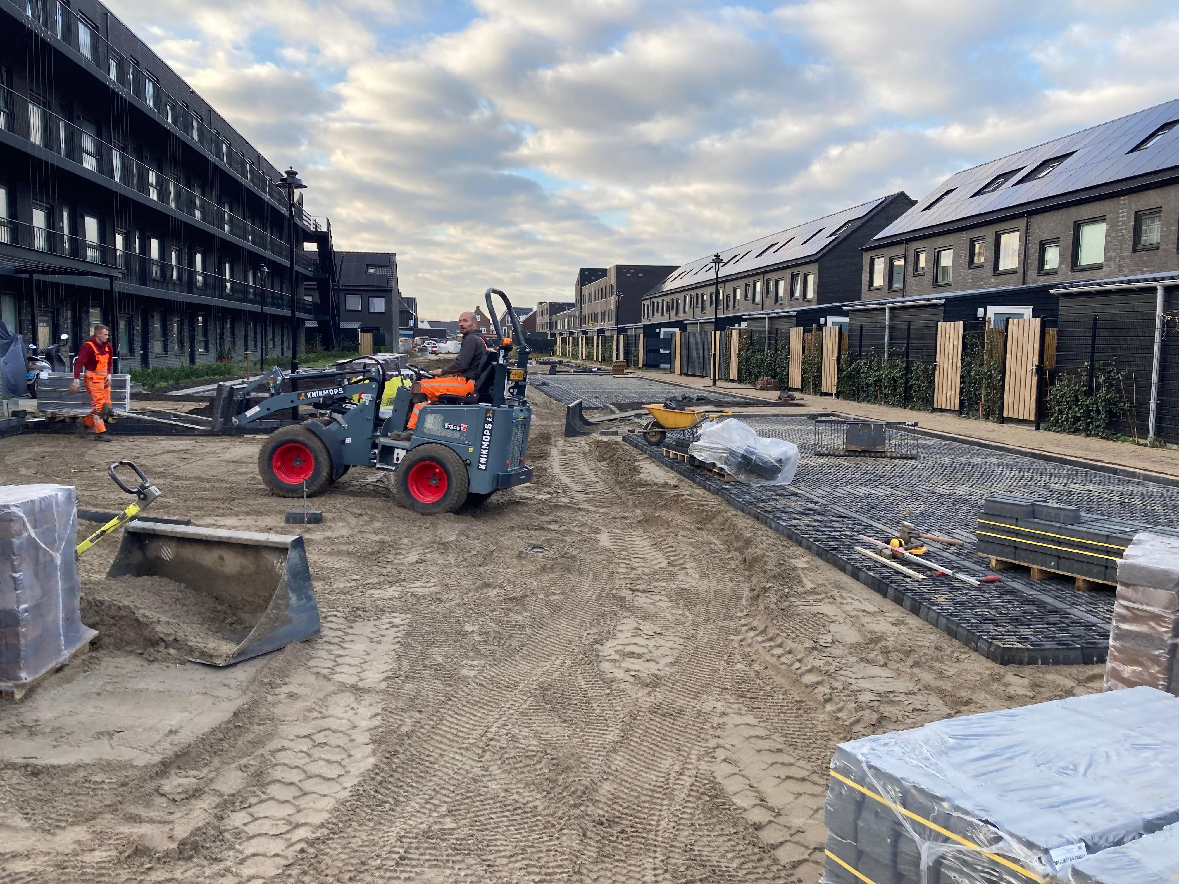 Op de werf werken we aan het parkeerterrein. Op de foto’s ziet u dat we bezig zijn met het aanleggen van de definitieve bestrating. Een deel van de tegels voor de parkeerplaatsen ligt er al in. De rest volgt zo snel mogelijk. De plekken waar nu zwarte grond ligt, zijn alvast klaargemaakt voor het aanbrengen van groen. In deze bodem kunnen bomen en planten goed en gezond groeien.