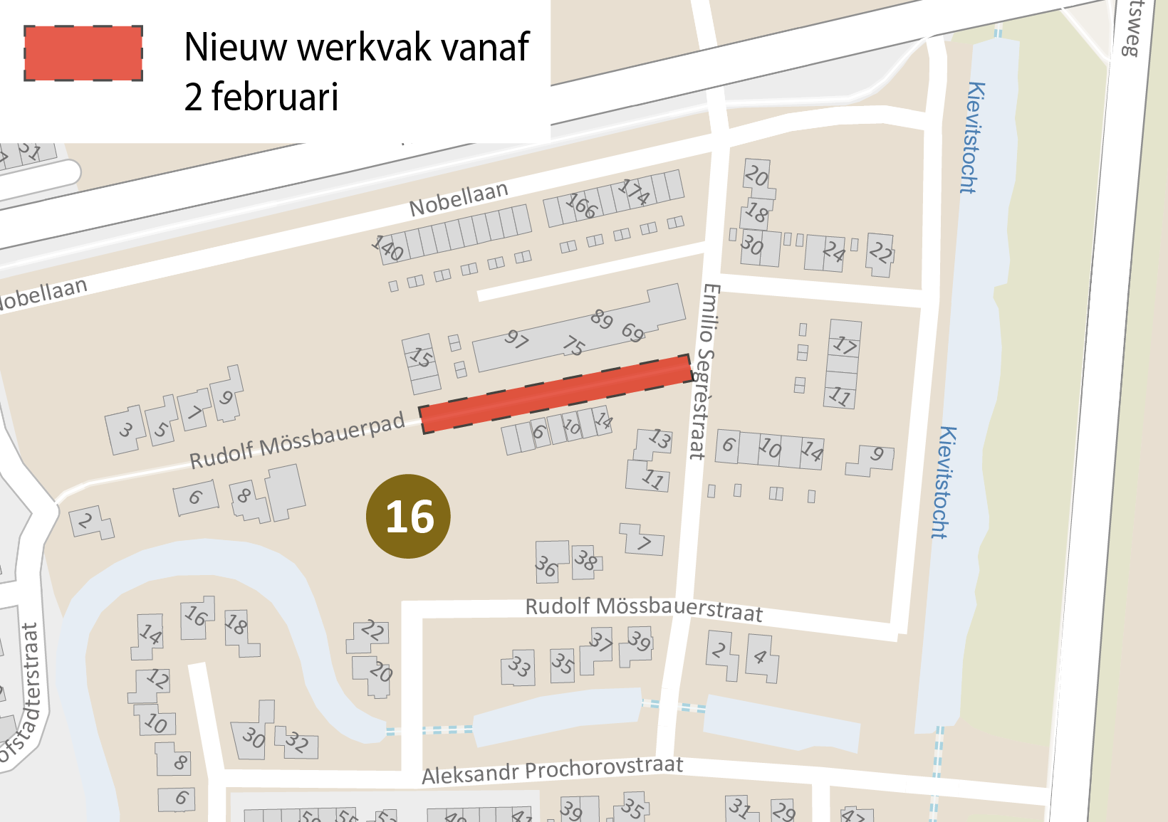 Vanaf maandag 2 februari starten wij met werkzaamheden aan het Rudolf Mössbauerpad. Wij leggen hier het eerste deel van het loop- en fietspad aan. Wij beginnen ter hoogte van de huisnummers twee tot en met veertien. Wij vragen bewoners om eventuele auto’s die daar staan vóór maandag 2 februari om 7.00 uur te verwijderen. Deze bewoners hebben hierover ook al een brief van ons ontvangen.