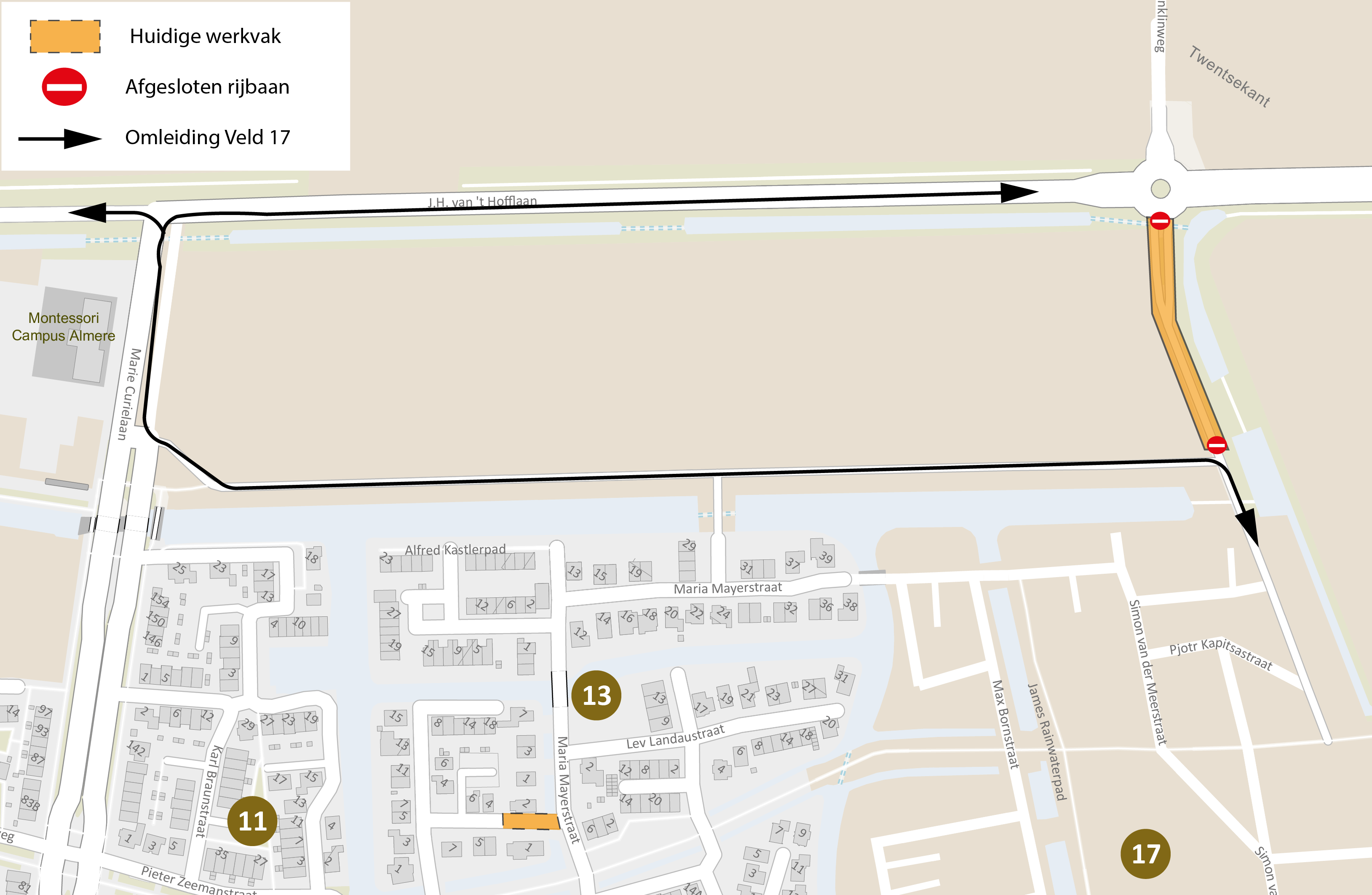 Door deze afsluiting kunt u tijdelijk geen gebruikmaken van deze directe verbinding. Bewoners van veld 17 kunnen de omleiding volgen die op de kaart hieronder staat aangegeven. Langs de route plaatsen wij duidelijke borden die de omleidingen ook goed aangeven.