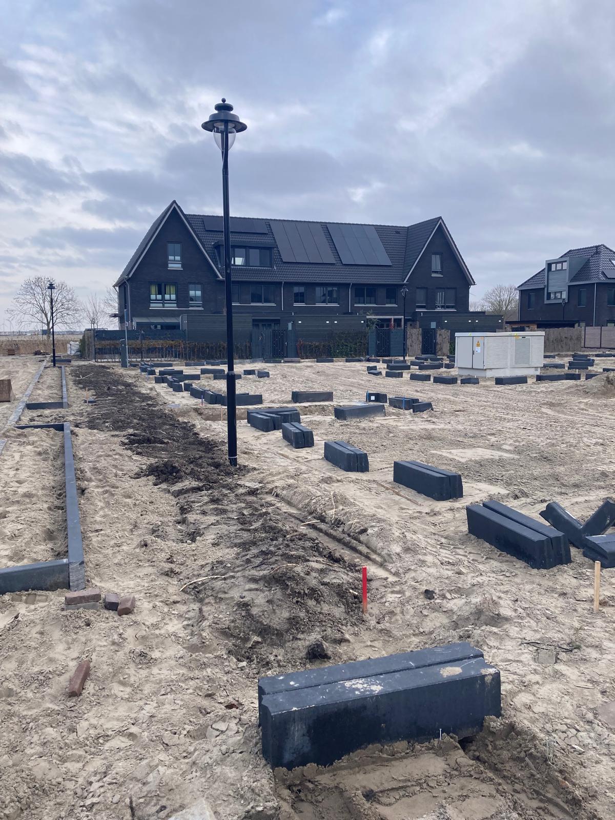 Voor de huisnummers één tot en met negen ligt de bestrating volledig in. Ook bij de huisnummers elf tot en met negentien maken wij goede voortgang.