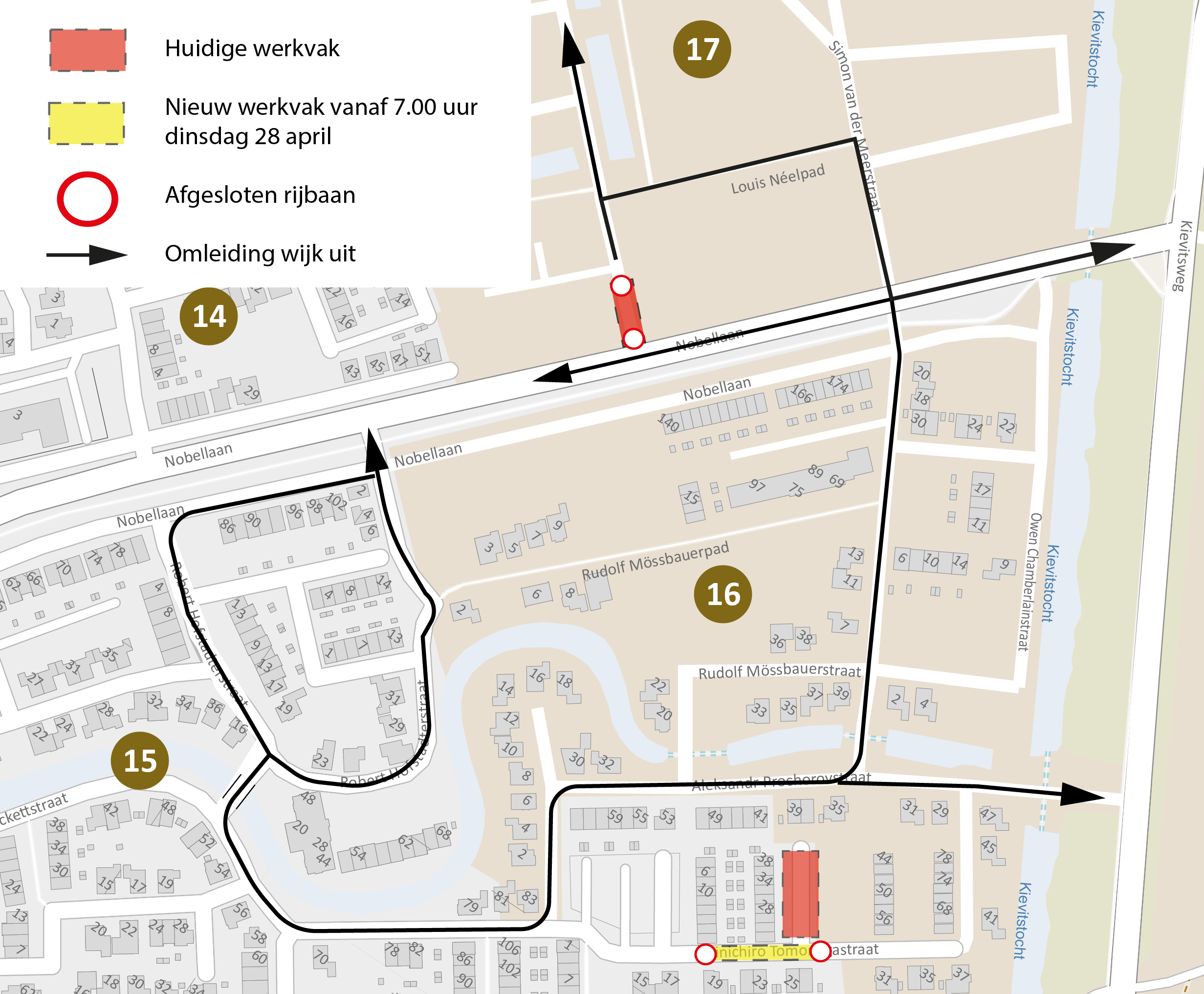 Tijdens de afsluiting staan bij alle opritten naar de Nobellaan verkeersregelaars. Zij helpen u met het vinden van de juiste route. Zo kunt u vanuit veld 13, 14, 15, 16 en 17 de wijk blijven verlaten.